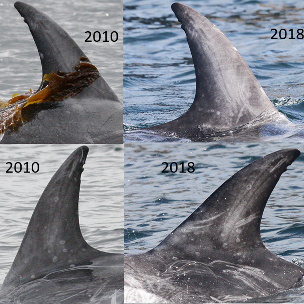 Image on the right shows individual Risso's dolphin 'Seaweed' (LW0005), first encountered in 2005, again in 2010, then every year between 2013 and 2023.